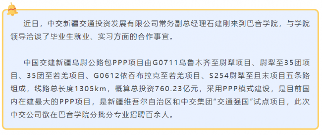 学院党委委员、教务处处长张敏与中交新疆交通投资发展公司常务副经理石建刚洽谈学生实习就业事宜
