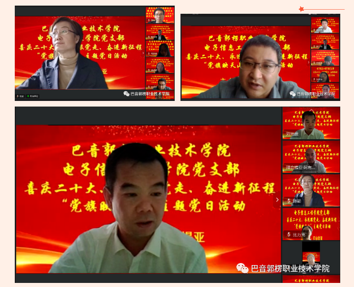 本次活动共七项议程,通过奏唱国歌、党员重温入党誓词、诵读党章、党员教师讲党课等活动激励党员教师牢记党的宗旨、坚定理想信念、履行党员义务、永葆共产党人先进本色。电子信息工程学院支委班子成员领学了《中国共产党第二十次全国代表大会在京开幕——习近平代表第十九届中央委员会向大会作报告》、《习近平:实施科教兴国战略,强化现代化建设人才支撑》、《习近平谈开辟马克思主义中国化时代化新境界》、《习近平指出,新时代十年的伟大变革具有里程碑意义》、《习近平强调,坚定不移全面从严治党,深入推进新时代党的建设新的伟大工程》等文件,全体教师聆听了副院长拜合提亚·阿布力孜同志以《喜庆二十大、永远跟党走、奋进新征程》为题的党课,最后参会党员教师进行了互动交流。