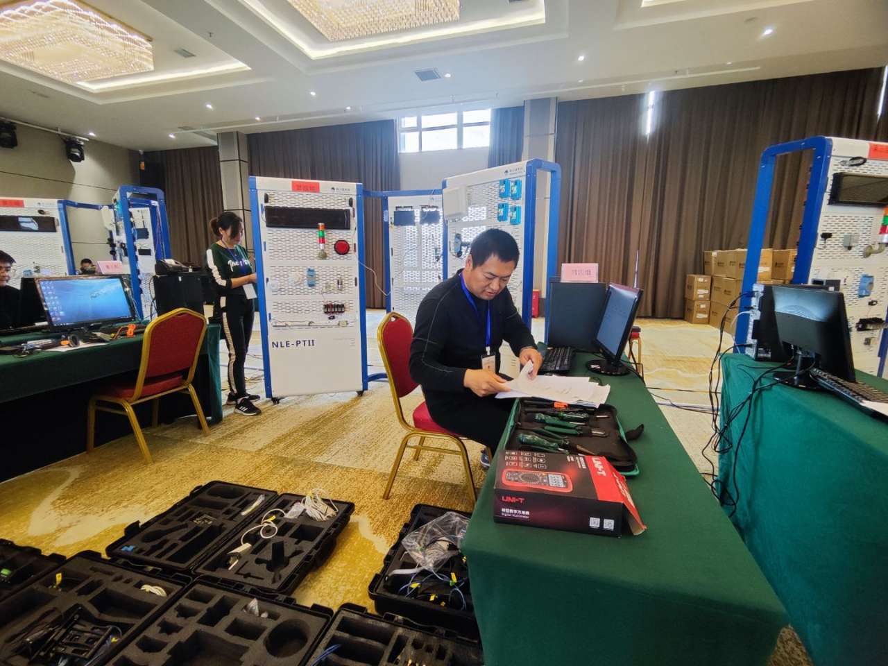 图为电子学院蹇文军、程萍老师正在参加物联网技术应用比赛