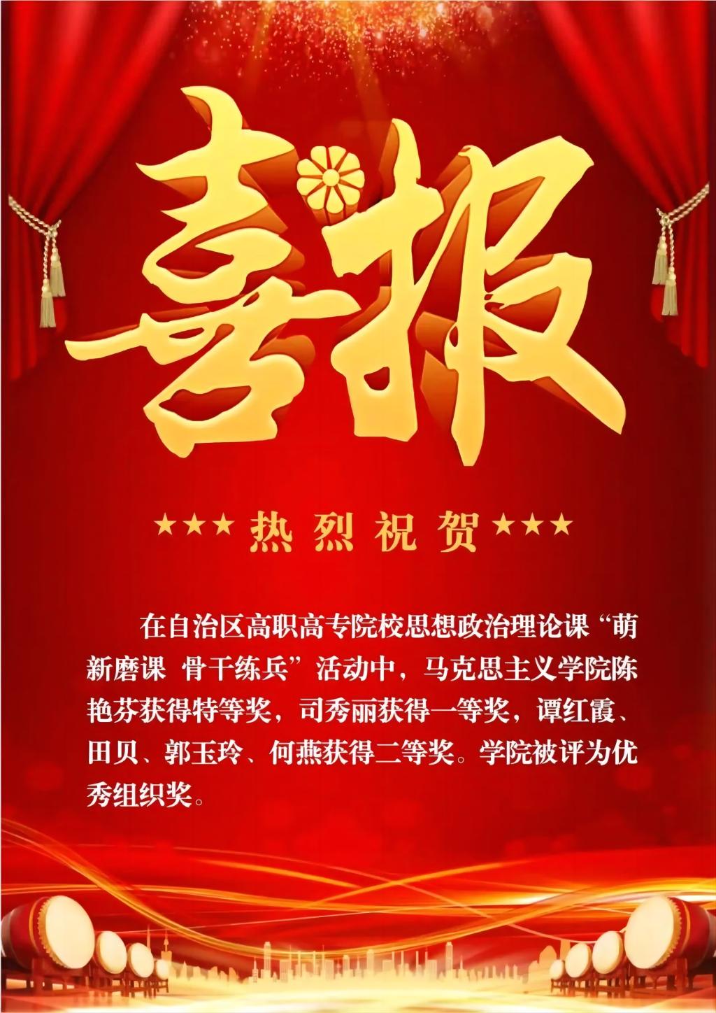 经过院内初选、线上复选、现场展示三个环节,马克思主义学院教师陈艳芬荣获《习近平新时代中国特色社会主义理论体系概论》骨干练兵组特等奖、教师司秀丽荣获《思想道德与法治》骨干练兵组一等奖、教师谭红霞荣获《毛泽东思想和中国特色社会主义理论体系概论》骨干练兵组二等奖、教师田贝荣获《习近平新时代中国特色社会主义理论体系概论》萌新磨课组二等奖、教师郭玉玲荣获《思想道德与法治》萌新磨课组二等奖、教师何燕荣获《毛泽东思想和中国特色社会主义理论体系概论》萌新磨课组二等奖。
