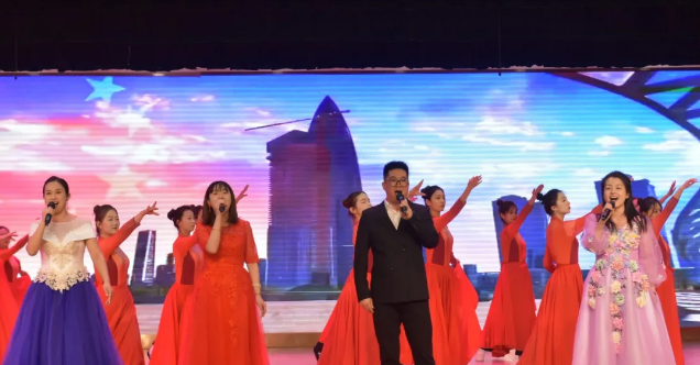传媒学院以经典主旋律歌曲《幸福中国一起走》为基础,融合歌伴舞艺术形式,通过优美的旋律与动人的舞姿,表达对祖国的热爱与祝福。