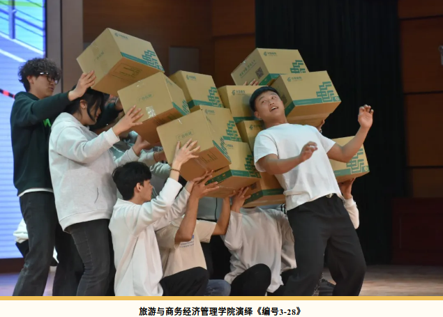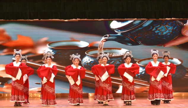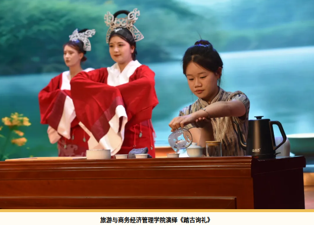 旅游与商务经济管理学院以《茶经》《周礼》为文化基因,通过行茶十式礼仪串联古今,以古典舞身韵解构“礼”的肢体符号,展现传统文化在当代文旅产业中的美学重构。