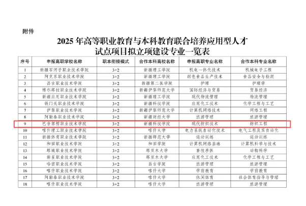 根据新疆维吾尔自治区教育厅公布的高等职业教育与本科教育联合培养试点项目名单,best365中国官方网站现代纺织技术高职专业与新疆科技学院纺织工程专业联合申报的高等职业教育与本科教育联合培养“3+2”应用型人才试点项目成功入选。