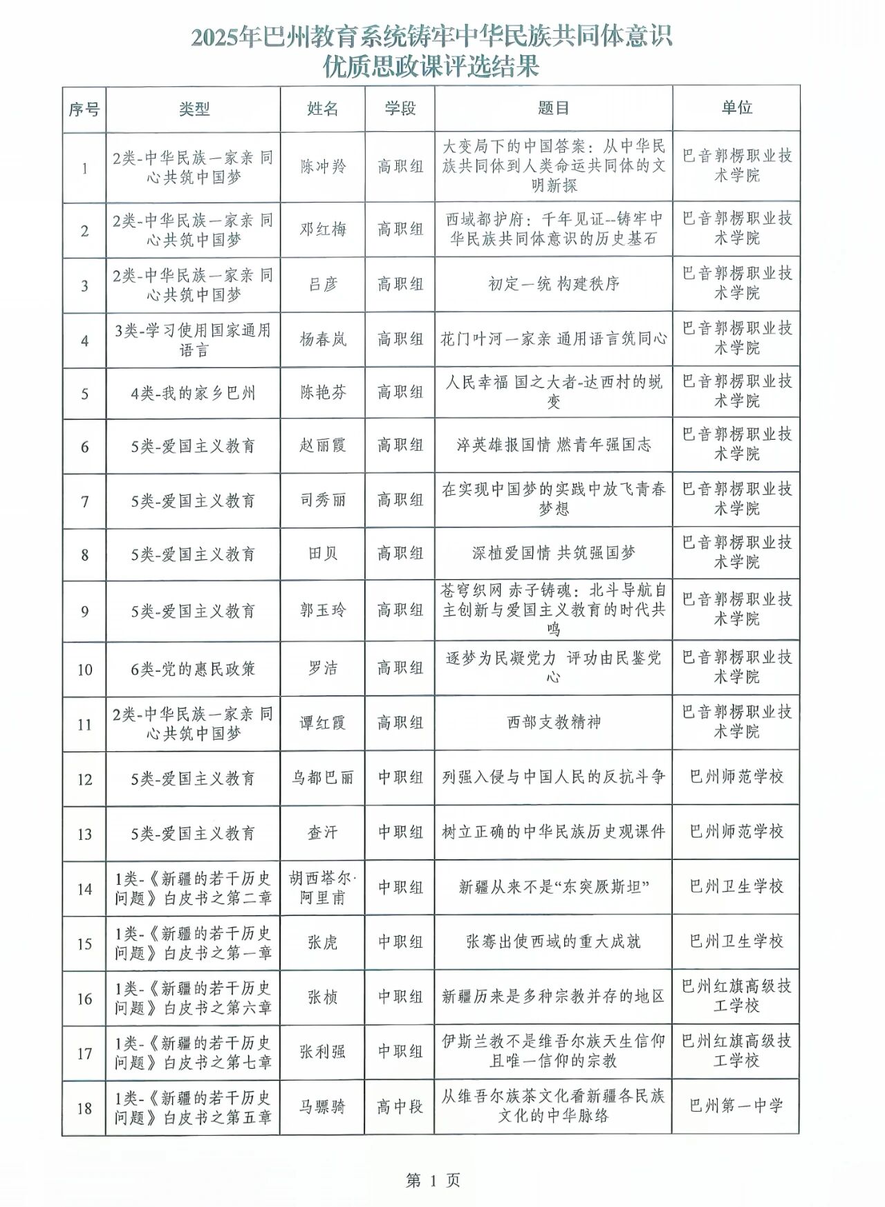 为深入贯彻落实中央民族工作会议精神及新时代党的民族工作方针政策,推动铸牢中华民族共同体意识教育融入思想政治理论教学体系,提升全州教育系统思政教师教育教学的针对性与实效性,2025年1月,巴州教育局开展了“铸牢中华民族共同体意识优质思政课”征集评选活动,经专家评审,最终评选优质思政课100堂。
