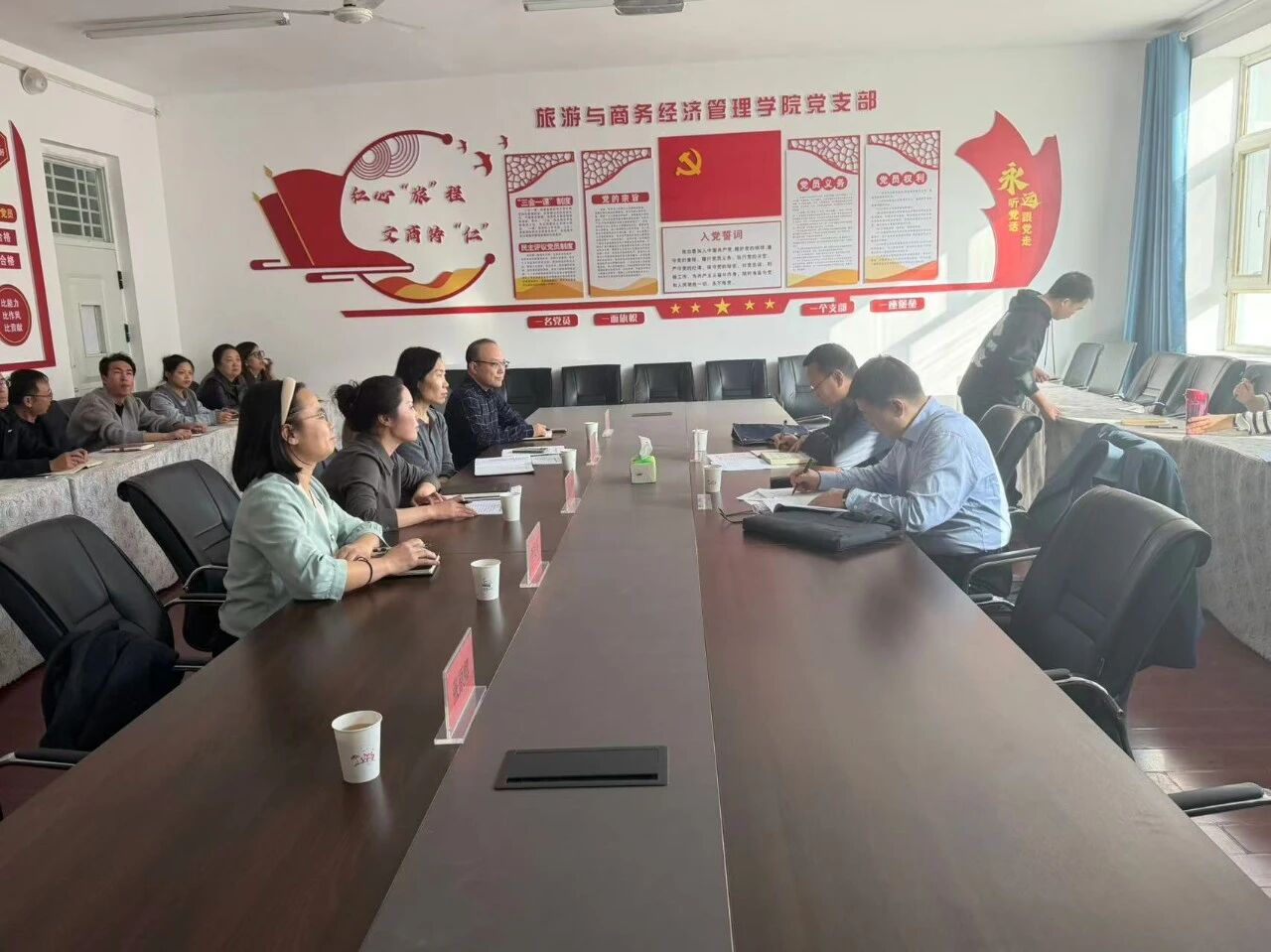 在旅游与商务经济管理学院,现场与师生探讨教学改革路径,鼓励其依托巴州旅游资源优势,打造“文旅融合”特色专业群。