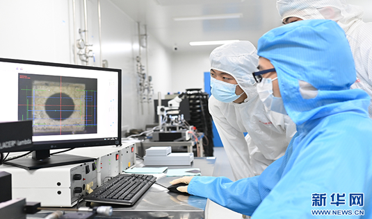 在硅光子人才培养与技术创新中心,学生使用仪器进行芯片的表面观察。新华网发(孙凯芳 摄)