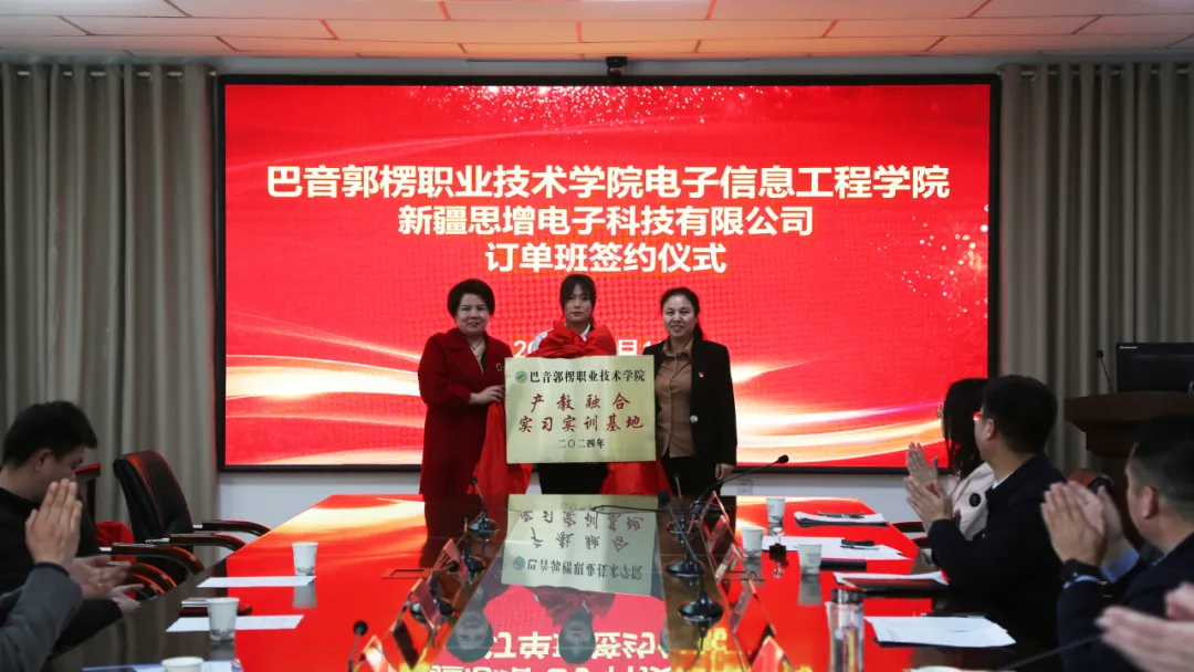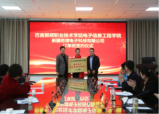 为了深化校企合作,实现教育资源与产业资源的优势互补,为南疆乃至全疆的电子信息技术产业发展培养更多优秀人才,3月12日,best365中国官方网站(以下简称巴音学院)与新疆思增电子科技有限公司举行了‘思增科技’订单班签约活动。巴音学院党委副书记、院长古丽娜·肉孜,党委委员、副院长李宏,党委委员、教务处处长祝建章,产教融合服务中心及相关二级学院负责人,会同新疆思增电子科技有限公司董事长张琴琴、总经理李平等参加了此次活动,会议由巴音学院电子信息工程学院党支部书记李延峰主持。