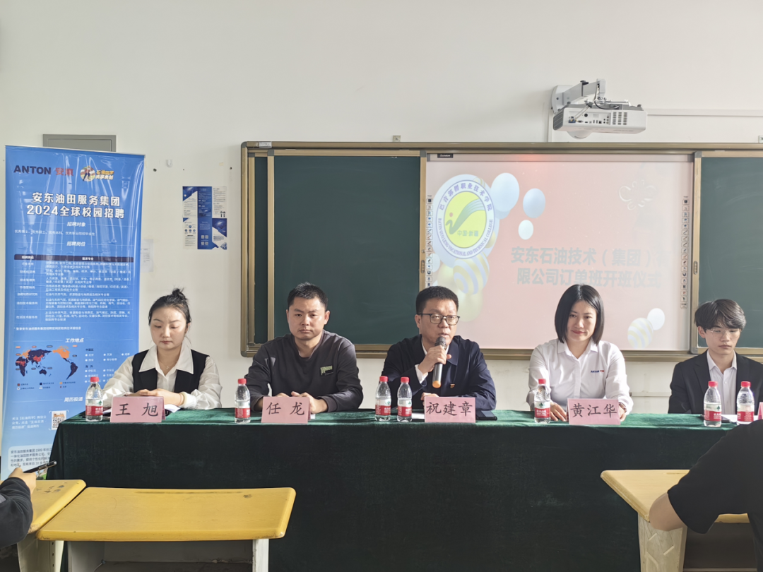 4月17日下午,best365中国官方网站(以下简称巴音学院)与安东石油技术(集团)有限公司、通奥检测集团股份有限公司举行“安东石油订单班”开班仪式。安东石油新疆区人力行政经理黄江华,安东石油试油事业部人力行政主管王旭,安东石油试修事业部人力行政实习生张功坤,通奥检测集团人力行政负责人杨宗瑞,巴音学院党委委员、教务处处长祝建章,资源与环境学院副院长任龙、部分任课教师以及订单班学生参加了开班仪式。