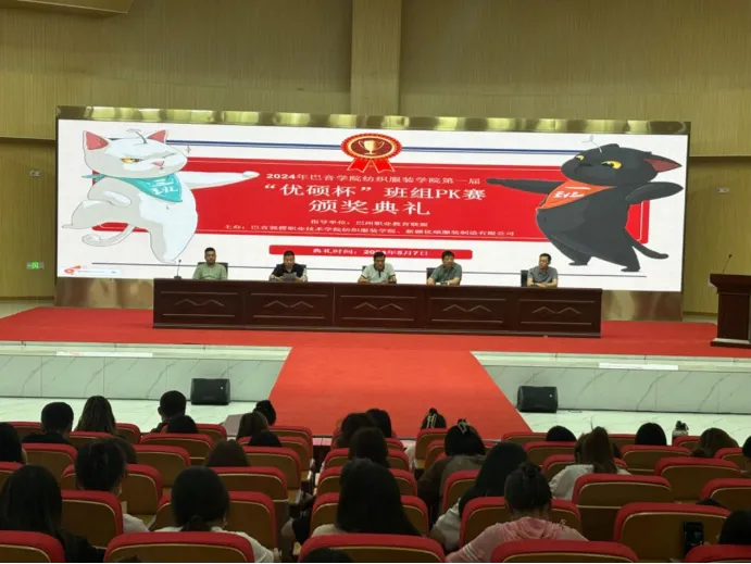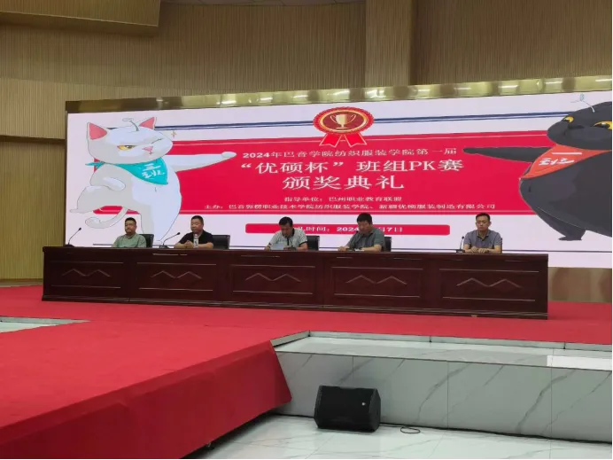为深入贯彻党的二十大精神,助推巴州职业教育高质量发展,5月7日,best365中国官方网站(以下简称巴音学院)纺织服装学院以职业教育周为契机,在产教融合示范园二楼报告厅举行了第一届“优硕杯”生产班组PK赛颁奖典礼。巴音学院党委委员、纺织服装学院党支部书记阿布拉江·阿尤甫,纺织服装学院副院长袁彤,新疆优硕服装制造有限公司总经理沈书兵,巴音学院产教融合中心及纺织服装学院相关教师参加,巴音学院纺织服装学院副院长王庆主持活动。