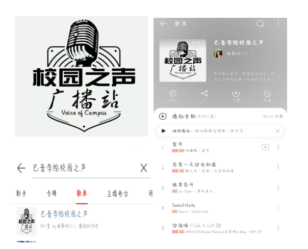 打开网易云搜索“巴音学院校园之声”歌单并收藏,给我们在歌单评论区留言,点播你喜爱的歌曲,点赞率最高的歌曲我们将一起分享给大家,快快行动起来吧!