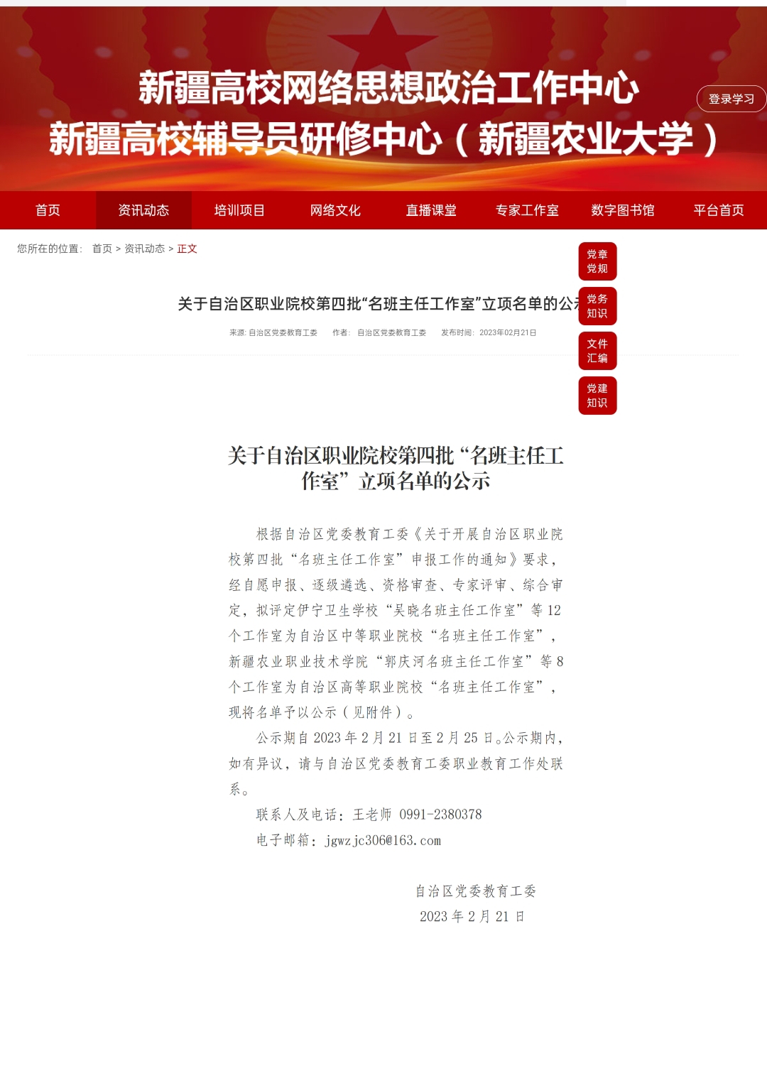 2023年2月21日,自治区党委教育工委公布了第四批自治区职业院校名班主任工作室立项入选名单,我院伊海涛主持的“班级‘工匠精神’教育的实践研究”入选。