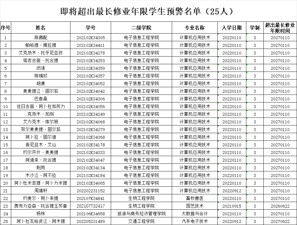 关于对25名即将超出最长修业年限学生的预警公告