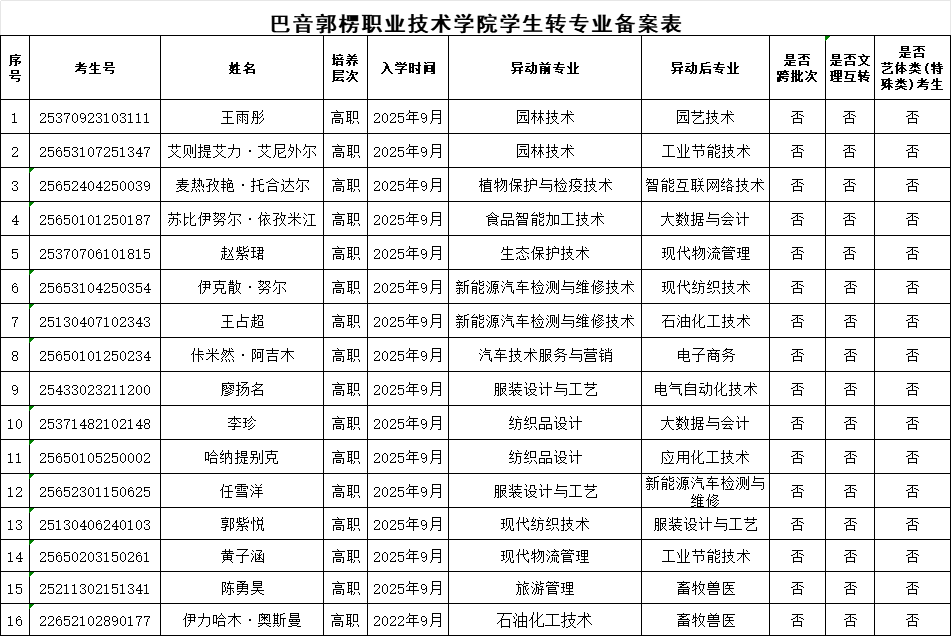 按照教育部《普通高等学校学生管理规定》(教育部41号令)、《高等学校学生学籍学历电子注册办法》及《best365中国官方网站学籍管理规定(修订)》、《军人抚恤优待条例》等文件精神,学生个人申请,招生就业处、学生工作部审核,经2026年1月7日第七次院长办公会研究,同意王雨彤等16名高职学生调整专业,现将同意转专业的学生名单予以通知,请相关二级学院及有关职能部门做好学生信息变更及学生档案、成绩、鉴定、资助、缴费等材料的交接工作。
