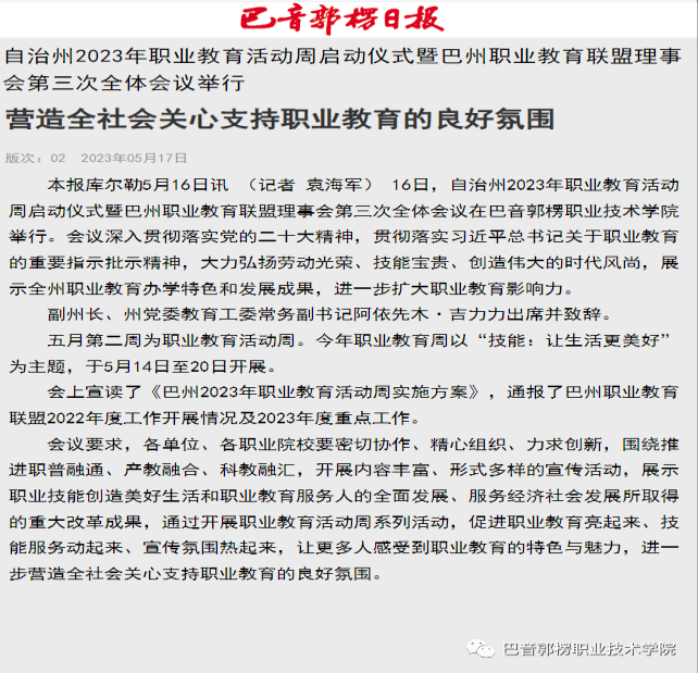 上一条: 【产教融合】轮台工业园区管委会与巴音学院举行政校合作共建职工培训实训基地和继续教育基地签约揭牌仪式