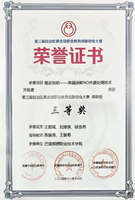 11月17日,第三届自治区黄炎培职业教育创新创业大赛现场决赛暨颁奖仪式在新疆轻工职业技术学院成功举办。自治区党委统战部,自治区教育厅,新疆中华职业教育社有关领导和参加总决赛全体师生及企业观摩代表等出席颁奖仪式。best365中国官方网站(以下简称巴音学院)参赛项目《氮定如初—果蔬保鲜NO外源处理技术开拓者》获得高职组区赛三等奖。