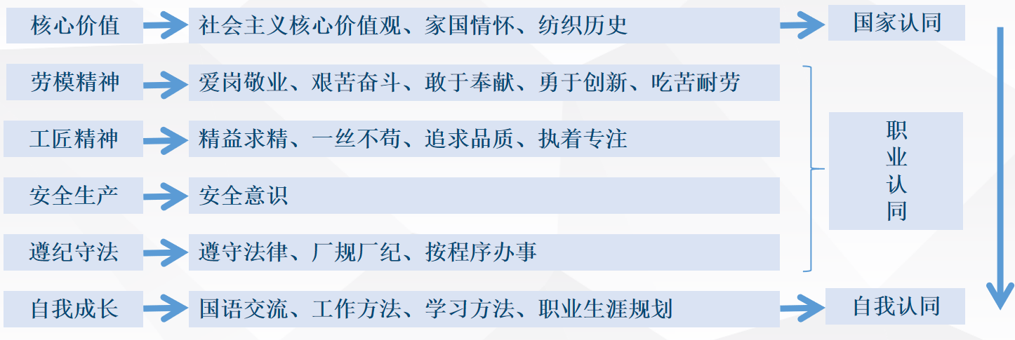 结合课程素质目标和新疆纺织产业、生源实际情况,按照家国情怀贯穿始终,一任务一故事,一任务一企业,一任务一科技的建设模式,融入核心价值观、劳模精神、工匠精神、安全生产等思政元素,实施课程思政育人。如在课程导入部分追溯纺纱历史,使学生深入理解我国的传统文化,培养爱国情怀,增强道路自信、文化自信;在每一工序讲述纺织先辈、劳模艰苦奋斗、勇于创新、拼搏实干的事迹,培养工匠精神、劳模精神、职业认同;引入合作企业设备、产品案例,培养学生对精益求精、严谨认真、爱岗敬业的工作态度;提炼纺纱工艺过程中蕴含的丰富的思政元素,培养实事求是、团结协作、合作共赢、坚持创新等价值取向,润物细无声的融入思政元素。通过培养学生的国家认同、职业认同,最终使学生成为职业生涯清晰并立志建设新疆的纺织产业人才,从而实现为党育人,为国育才的培养目标。