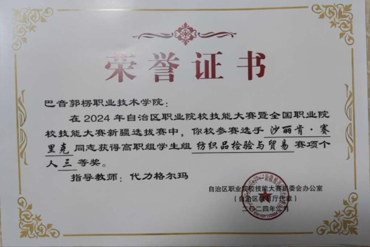 图7 自治区级纺织品检验与贸易技能大赛学生获奖证书
