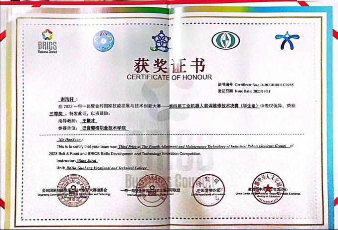图6 2023年一带一路暨金砖国家技能大赛学生获奖证书