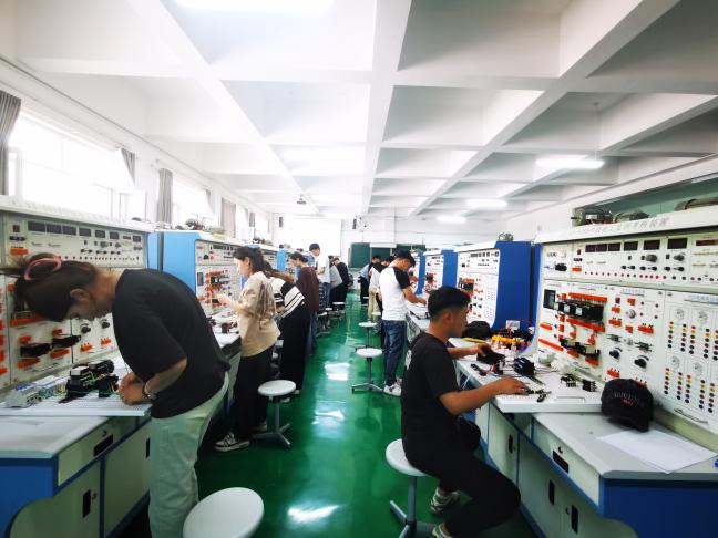 (2)教学设施:配备齐全的电气自动化实训室,不断优化实训环境,电气自动化技术专业目前建有11个实训室,除可以满足电气专业基础课和核心课程的实训教学任务外,还可以用于比赛训练,师资培训、社会培训等项目。主要实训室有光机电一体化实训室、气液电一体化综合实训室、工业自动化实训室,维修电工考核实训室,电力拖动实训室、电工电子创新实训室,现代电气控制综合实训室、电气安装综合实训室、智能控制综合实训室、仿真实训室。定期更新和维护实验设备,确保其正常运行和安全性。