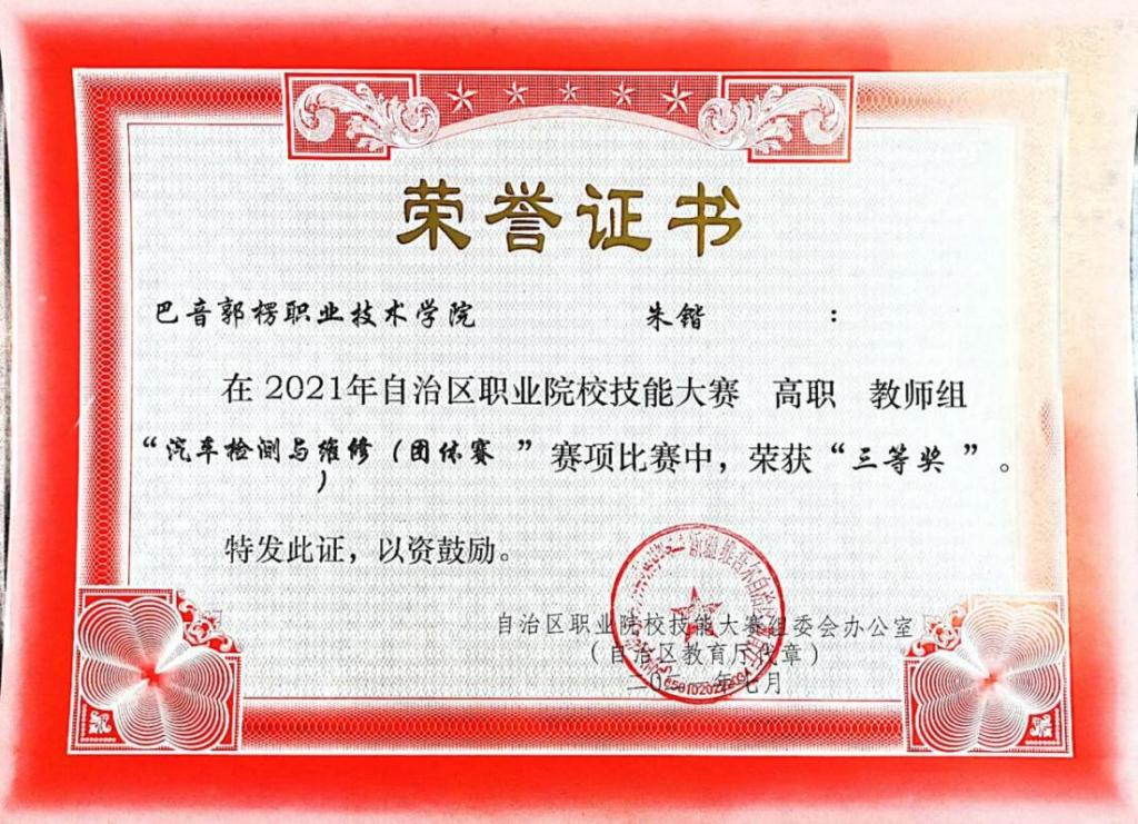图7 专业教师参加自治区汽车检测与维修技能大赛获奖证书